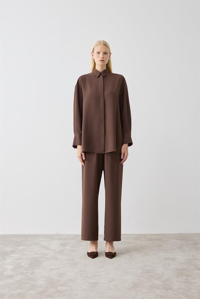 MİORİ LİNZA PLİSE GÖMLEKLİ PANTOLONLU KREP TAKIM KAHVE